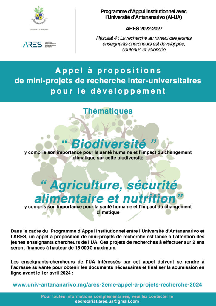 Le présent appel concerne les thématiques « Biodiversité » (y compris son importance pour la santé humaine et l’impact du changement climatique sur cette biodiversité), et « Agriculture, sécurité alimentaire et nutrition » (y compris les domaines de Sciences sociales ou Sciences humaines y afférentes), avec un appel à proposition qui sera lancé le 04 mars 2024, et un démarrage des projets sélectionnés pour le 1er septembre 2024.