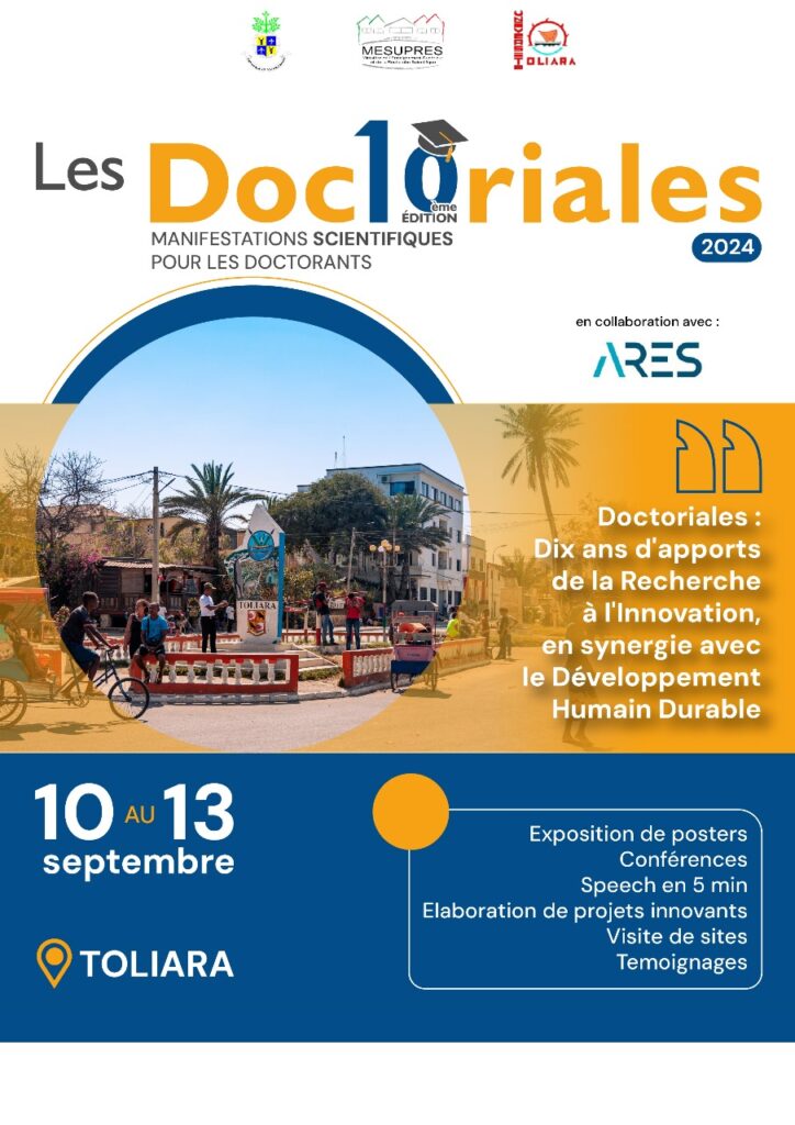l’Université d’Antananarivo organise chaque année “les DOCTORIALES” en collaboration avec le Programme d’Appui Institutionnel de l’ARES . Cette année nous célébrons la 10ème années d’existence de cet événement scientifique à l’Univesrité de Toiliara du 10 au 13 Septembre 2024.